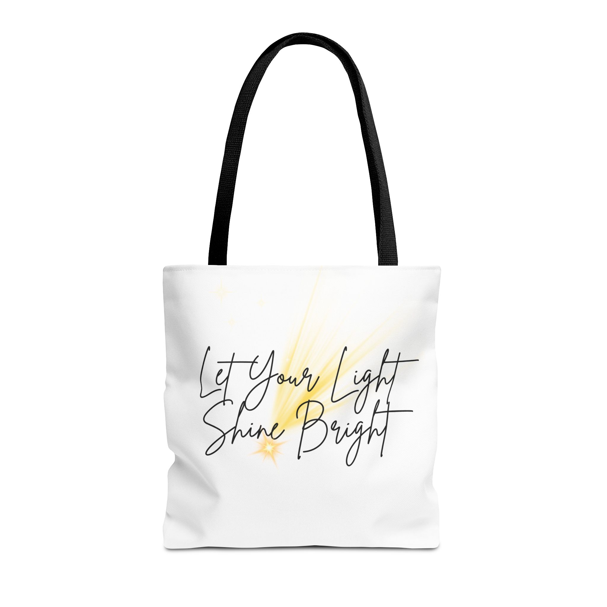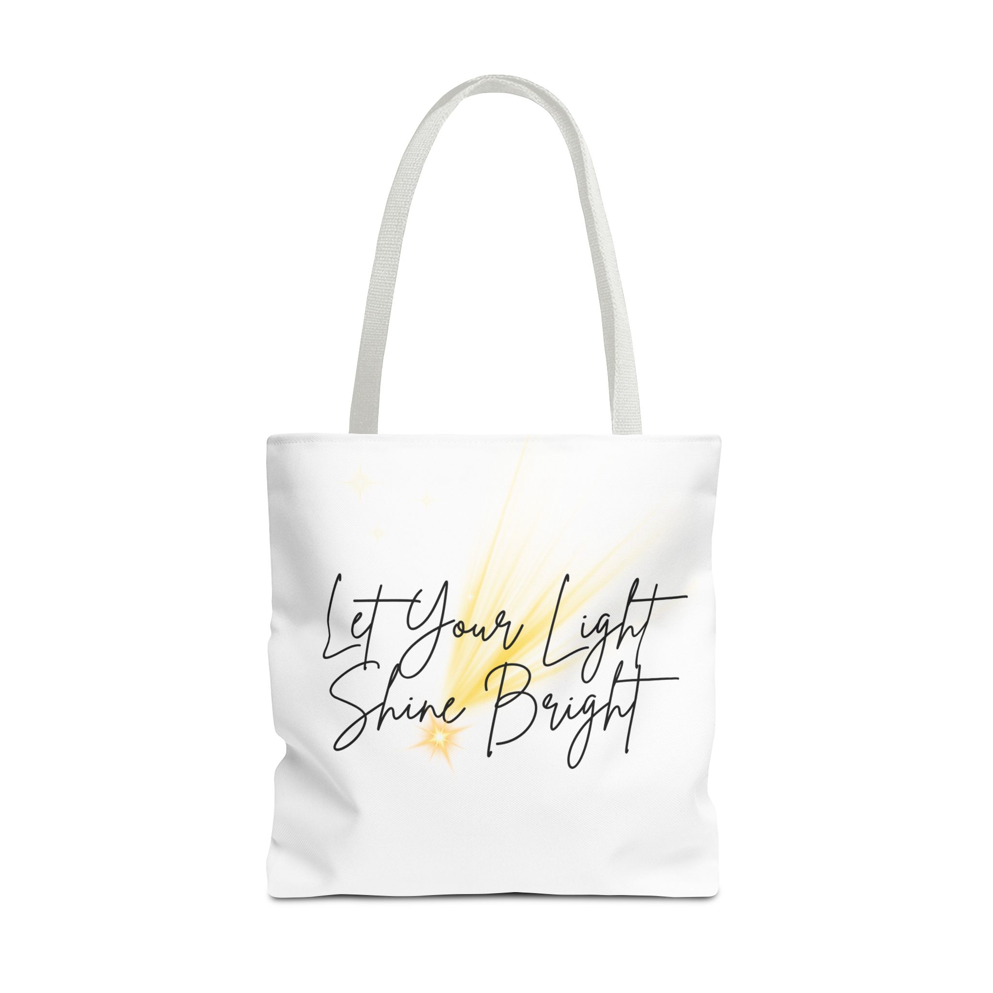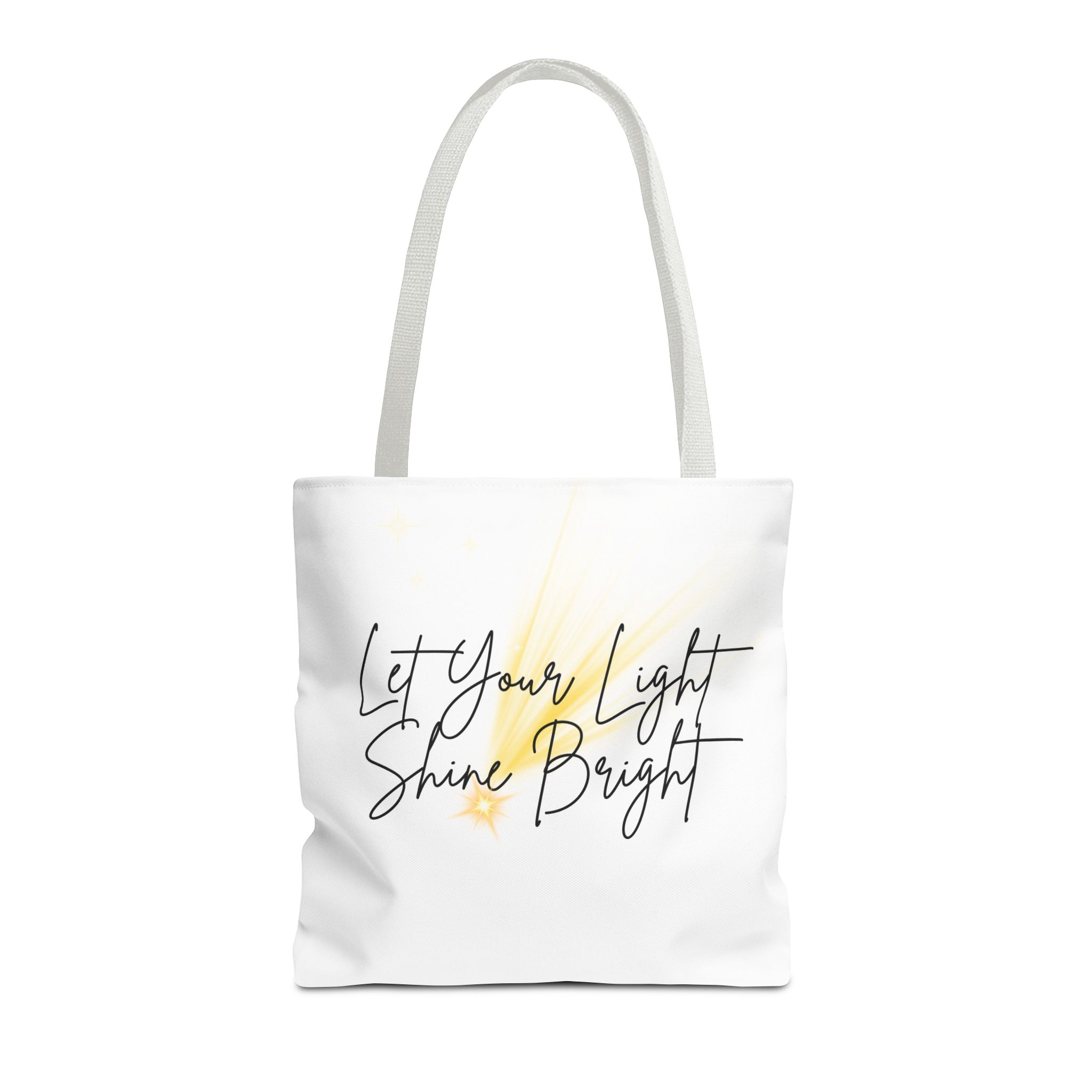 Soft white canvas with a gentle hand-lettered message—this tote quietly lifts your day. A warm, painterly wash of golden light sits behind the script, suggesting sunrise, candles, or the small sparks that keep us going. Lightweight yet sturdy, it carries groceries, notebooks, or a market haul without losing its shape. The black handles and subtle boxed corners give structure while the interior laminate keeps contents tidy. Wear it to quiet mornings at the café, community events, or whenever you want a little reminder to move through the day with calm confidence.