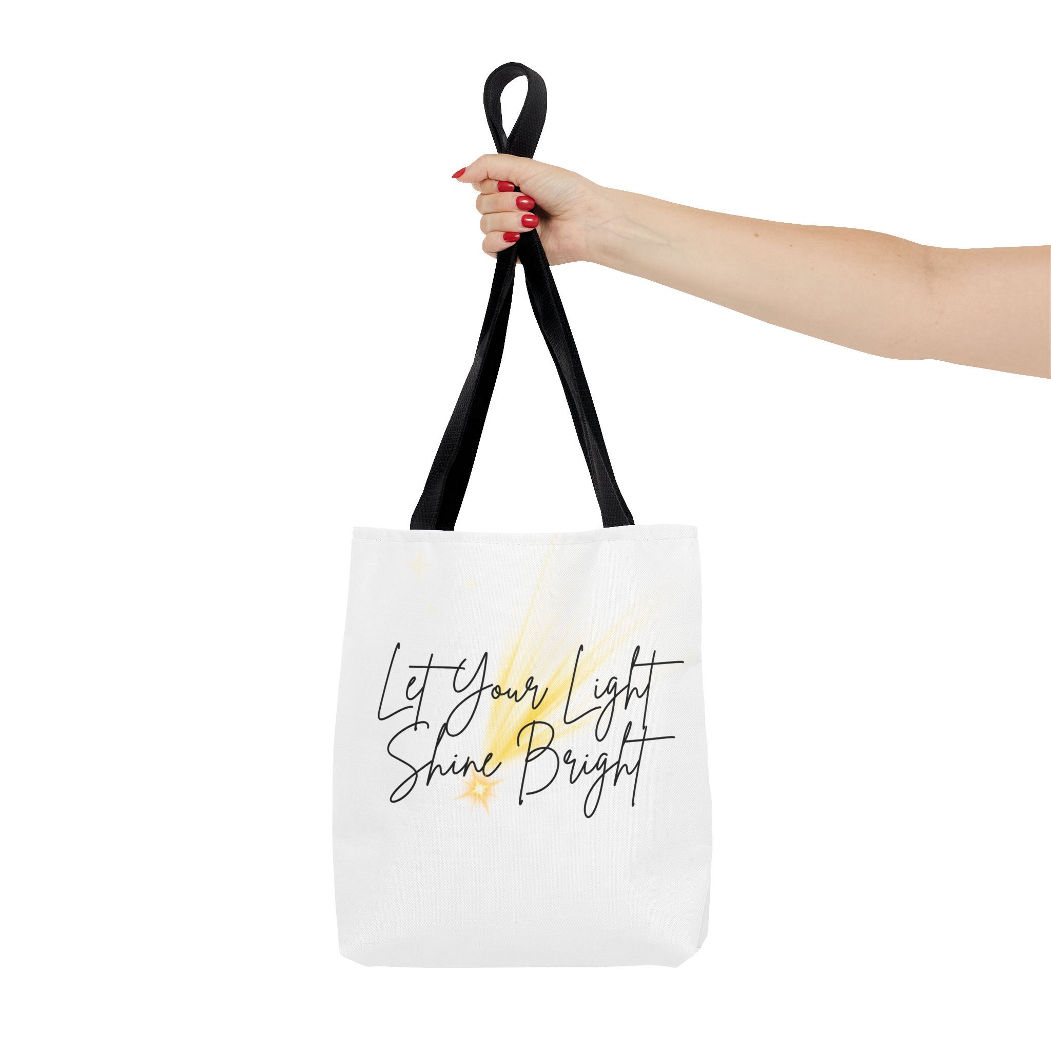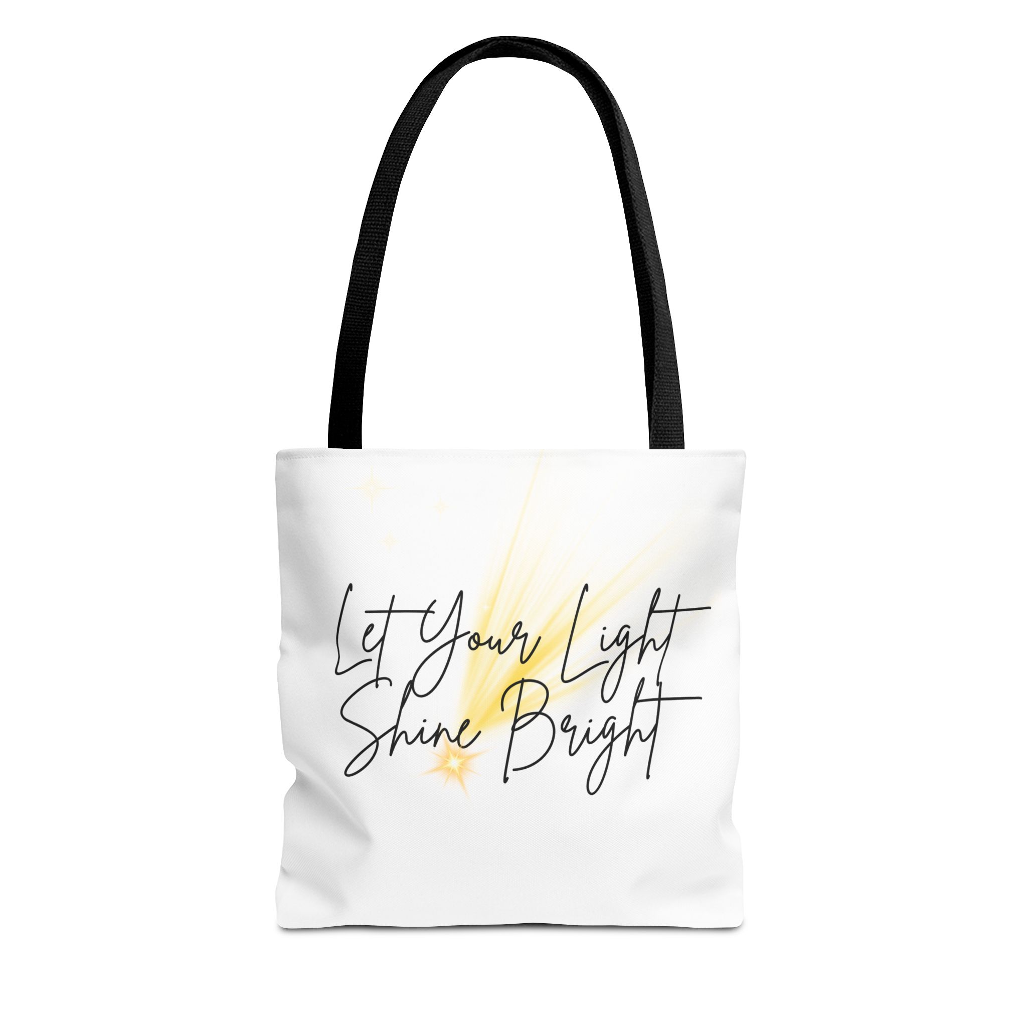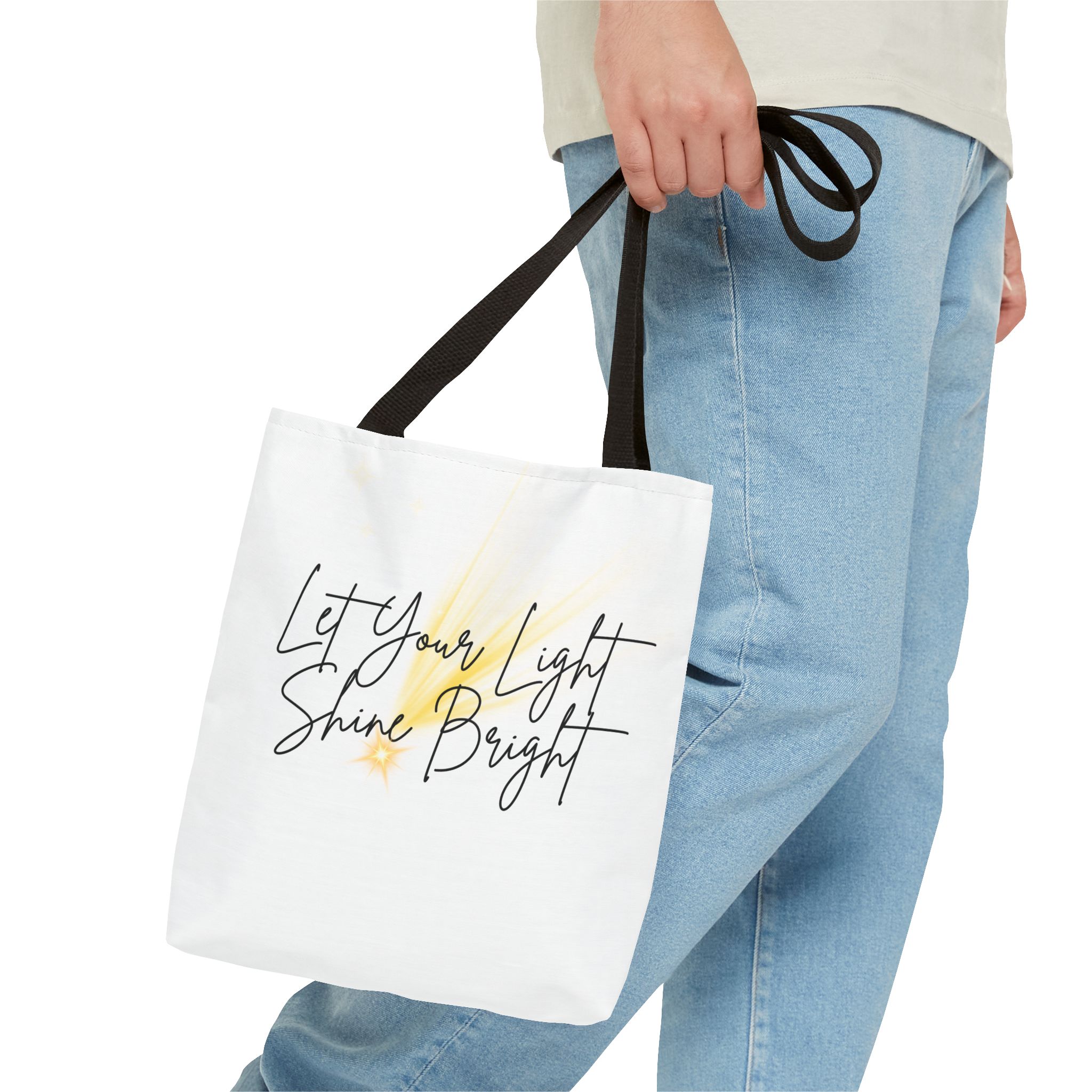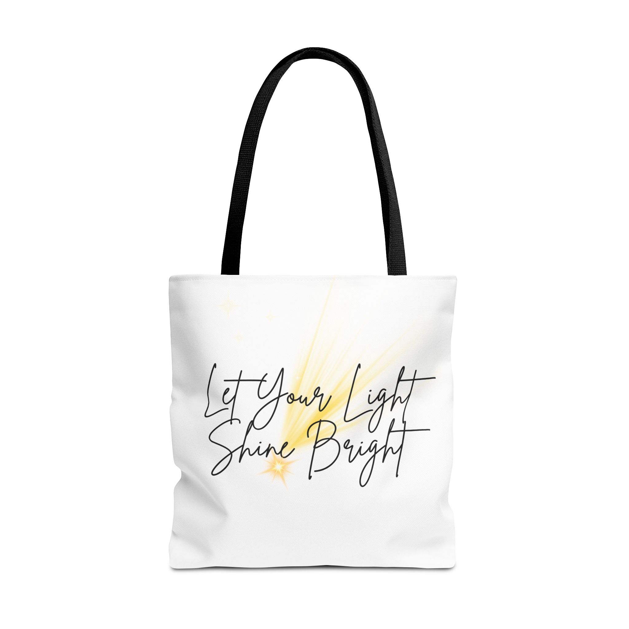 Soft white canvas with a gentle hand-lettered message—this tote quietly lifts your day. A warm, painterly wash of golden light sits behind the script, suggesting sunrise, candles, or the small sparks that keep us going. Lightweight yet sturdy, it carries groceries, notebooks, or a market haul without losing its shape. The black handles and subtle boxed corners give structure while the interior laminate keeps contents tidy. Wear it to quiet mornings at the café, community events, or whenever you want a little reminder to move through the day with calm confidence.